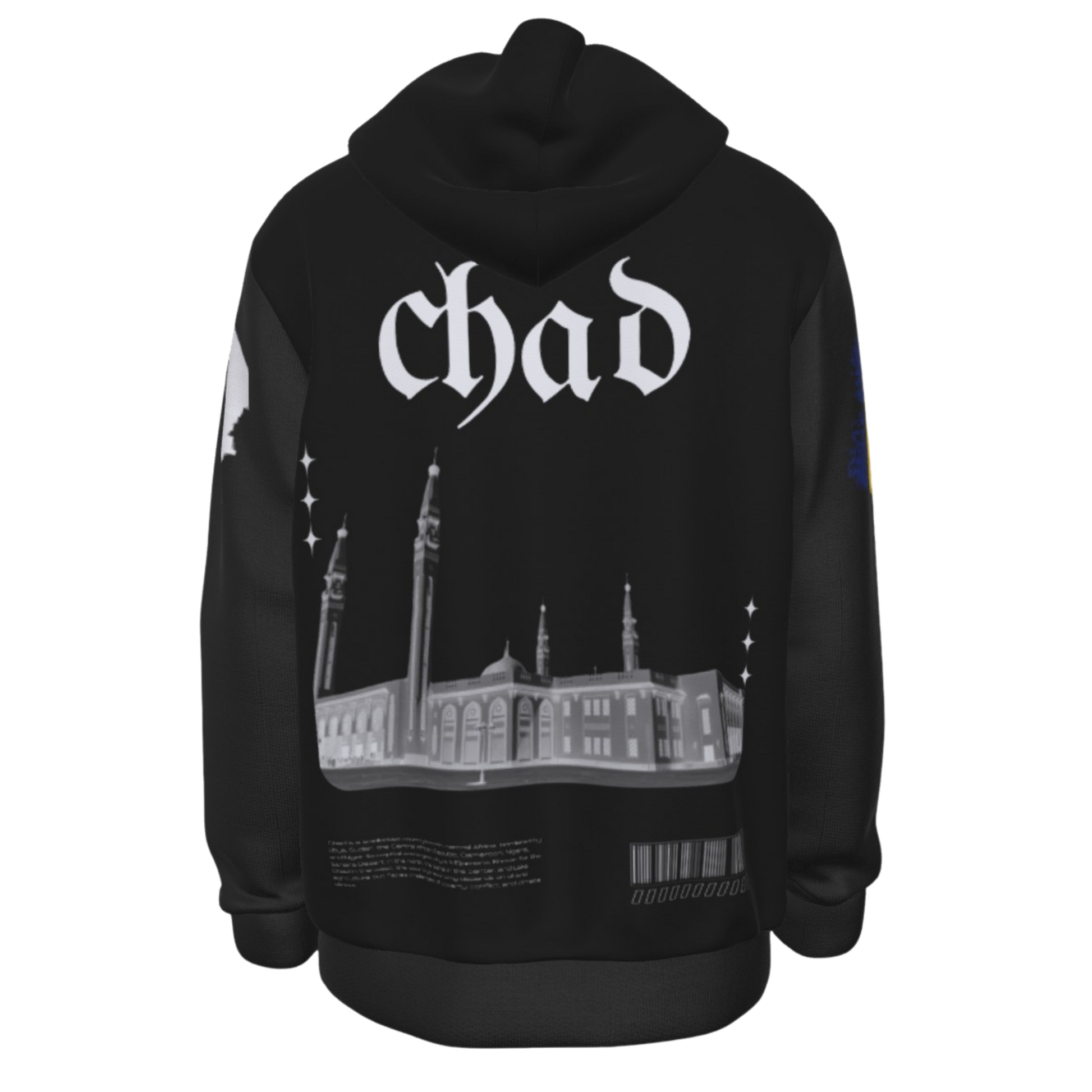 Represent your culture and your roots with this Chad Heritage Hoodie! This Hoodie includes the country's name on the Front, Map and Flag on the Sleeves and the country's name, a picture of it's biggest Mosque and it's brief description in the back! Order Now!