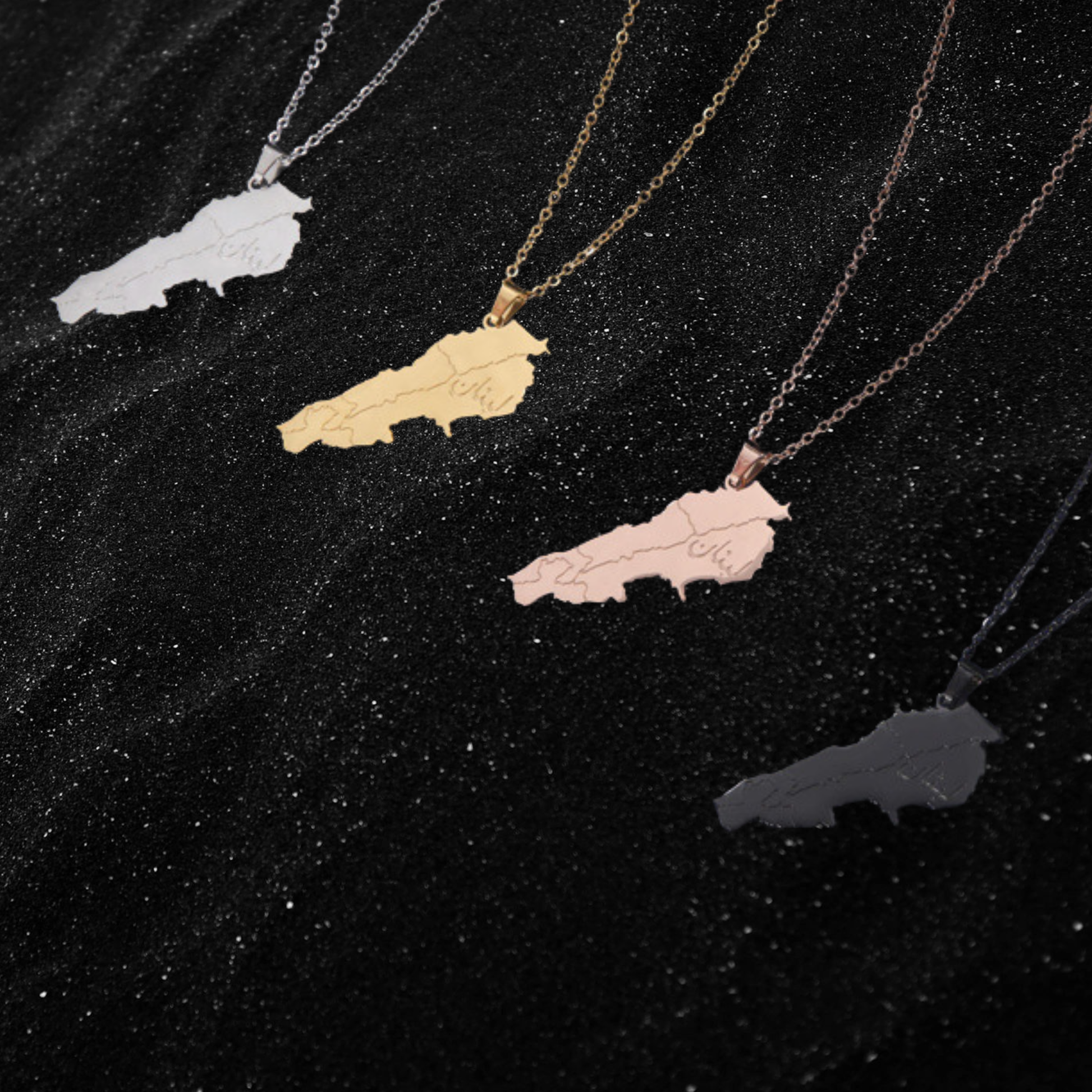 Represent your Heritage with this Lebanon Map Necklace. The Necklace is shaped as the map of Lebanon, and it contains the country's name in arabic as well as it's major regions borders. Available in Gold, Rose Gold, Black and Silver!