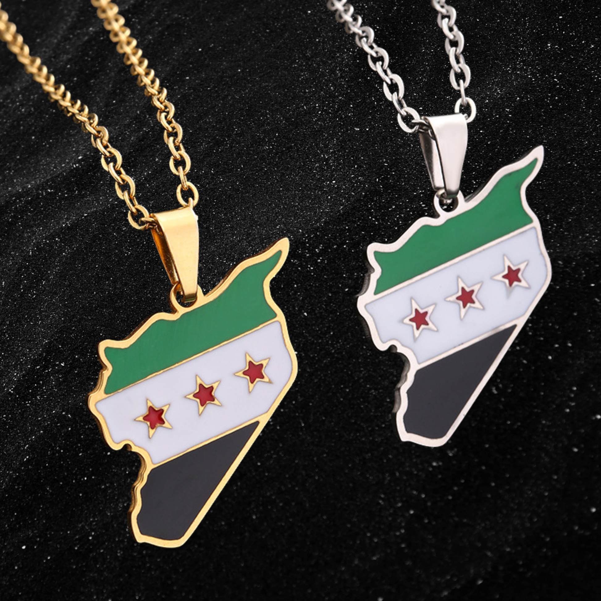 Represent your Heritage with this Syria Map Necklace. The Necklace is shaped as the map of Syria colored in it's Flag. Available in Gold and Silver!