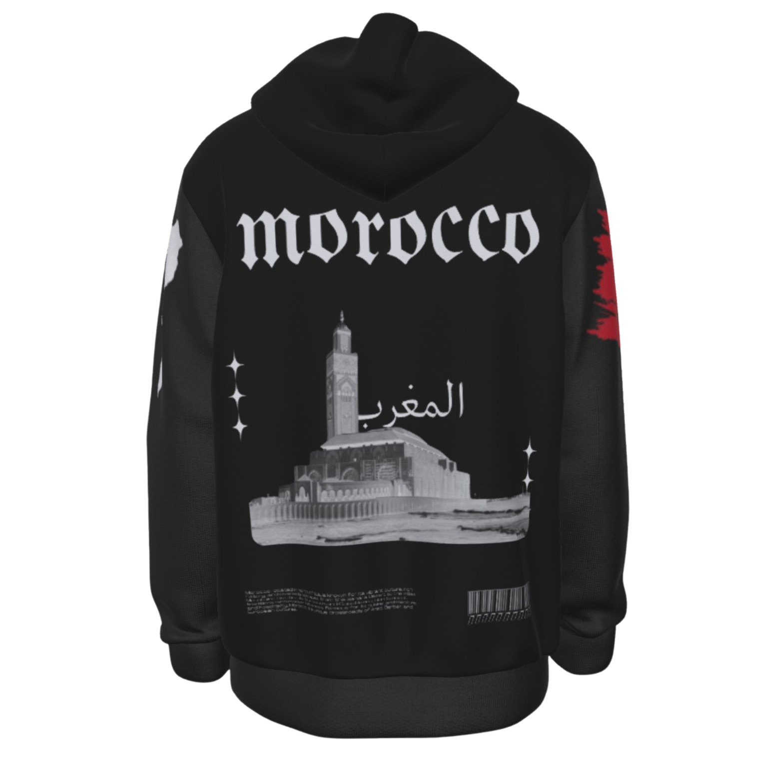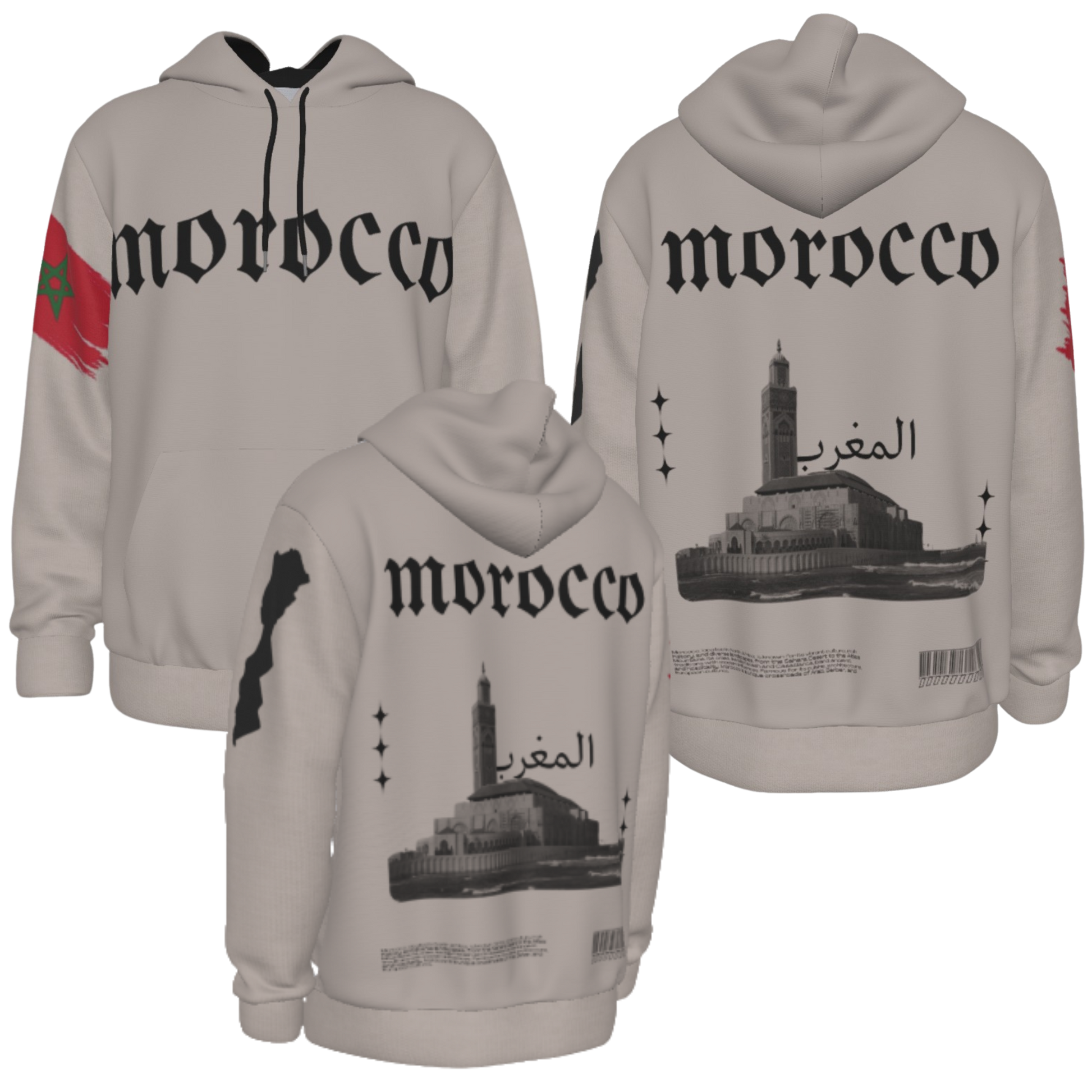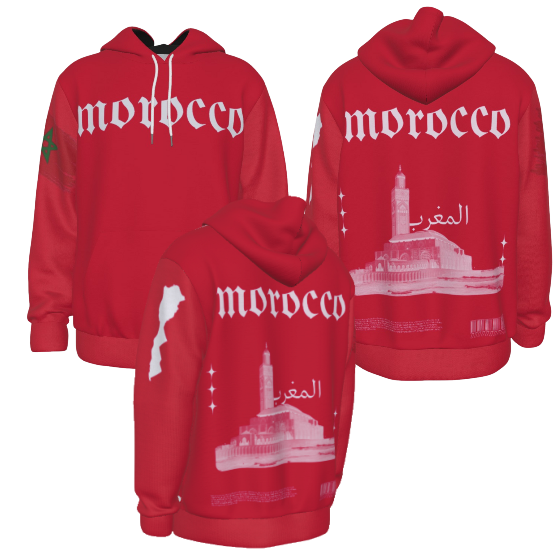 Represent your culture and your roots with this Morocco Heritage Hoodie! This Hoodie includes the country's name on the Front, Map and Flag on the Sleeves and the country's name, a picture of it's biggest Mosque and it's brief description in the back! Order Now!