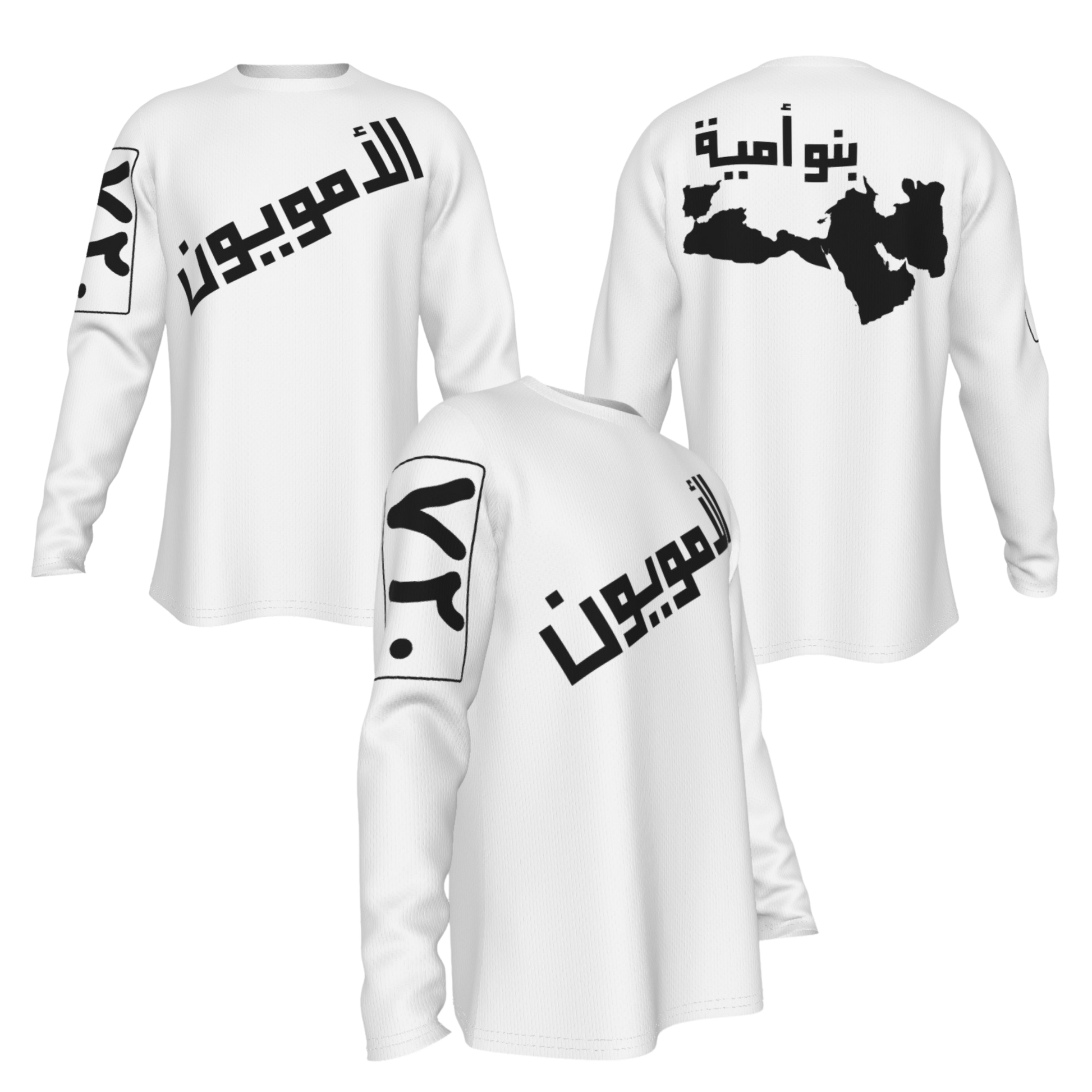 Stand out with this Umayyad Sweater. "الأمويون " in arabic on the front side of the shirt means "The Ummayyads", the ٧٢٠ on the sleeve (720 in english numbers) is the year when the Caliphate reached it's peak territory which it maintained for about 30 years. The back shows the map of the Umayyad Caliphate at its peak, as well as word بنو أمية which means Sons of Umayyads. This T-Shirt is available in various colors. Choose the one you like and order now!